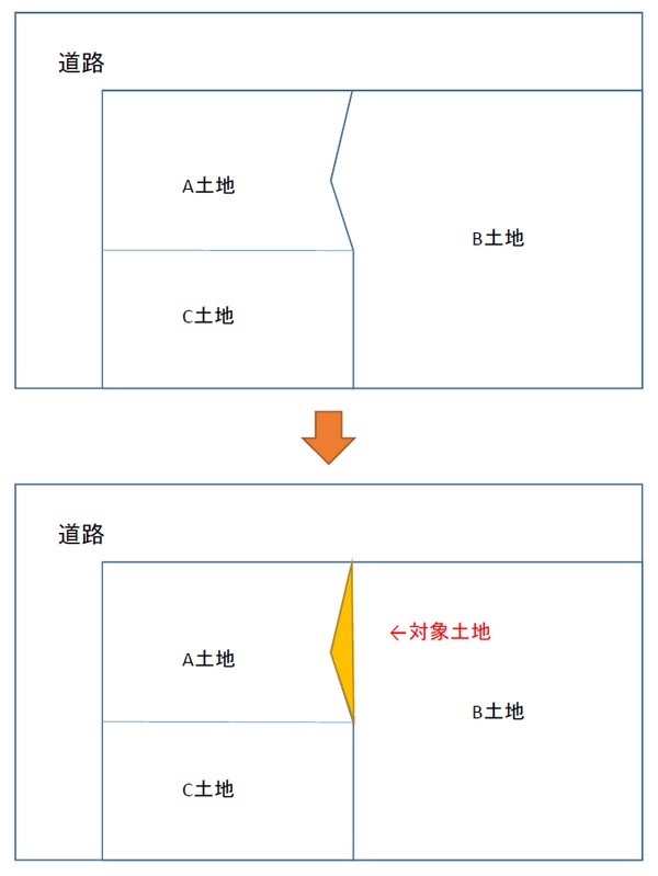 現状の土地利用では特に不具合があるわけではありませんが、この対象地を購入すると整形地にすることができます。